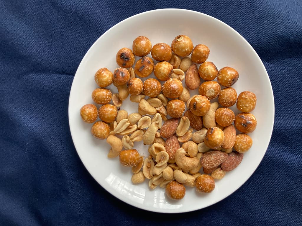 中身は普通のスナック菓子で、球状のビスケットとピーナッツ、アーモンド、カシューナッツが入っている