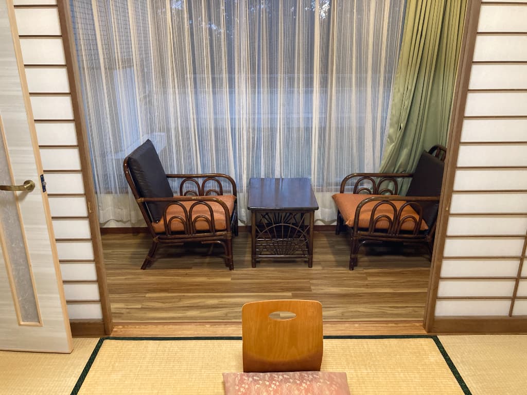 ロビーは重厚な作りで、昭和の面影がある。建物自体は昭和の終わりか、平成の初め頃に作られたそうだ。窓からは大室山が見える。