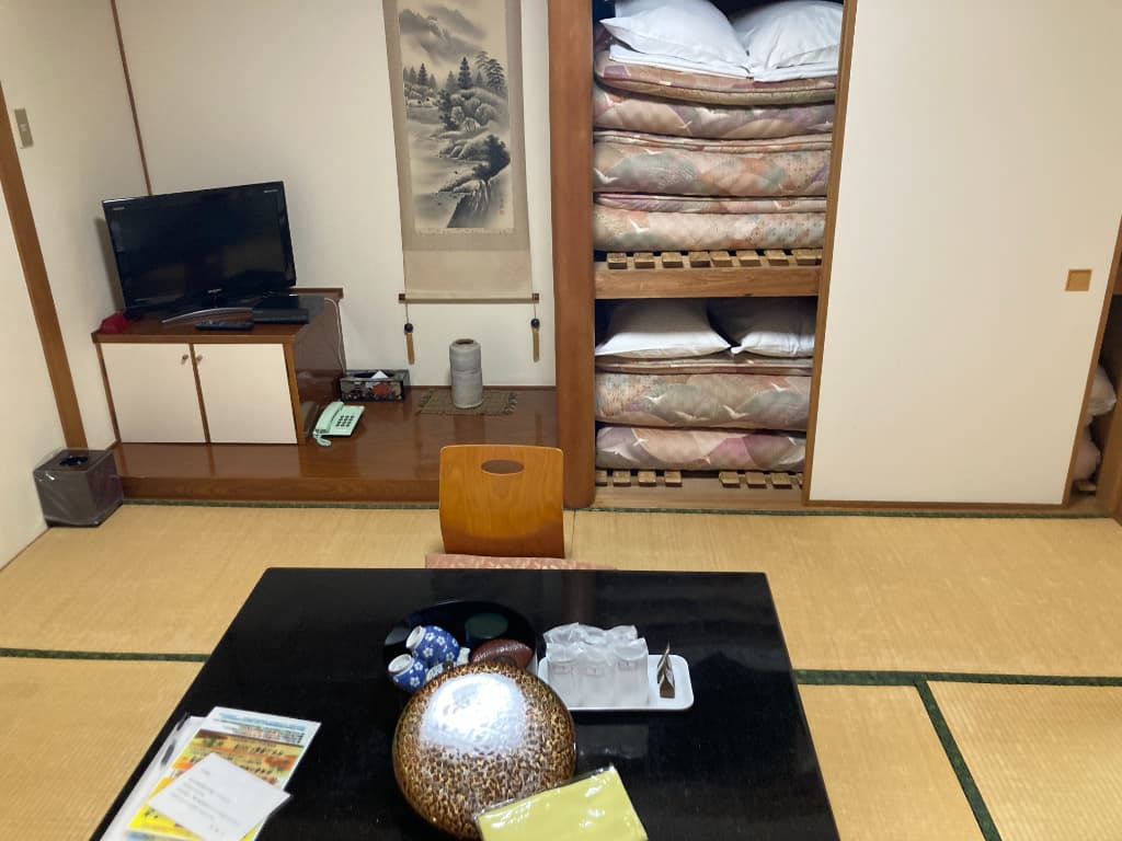 お部屋の様子。作りは温泉街のホテルとまったくそん色がない。お茶とお菓子も用意されている。
