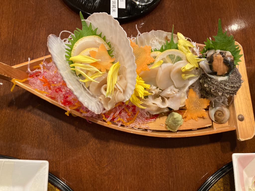 別料金で舟盛りを頼んだ。帆立とサザエの刺身が入っている。これで1人前の量である。