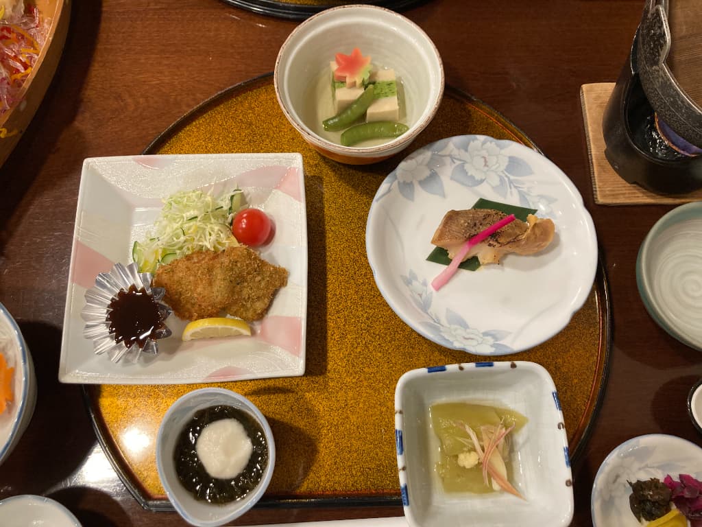 夕食の様子。温泉街のホテルとそん色ないメニューが並ぶ。