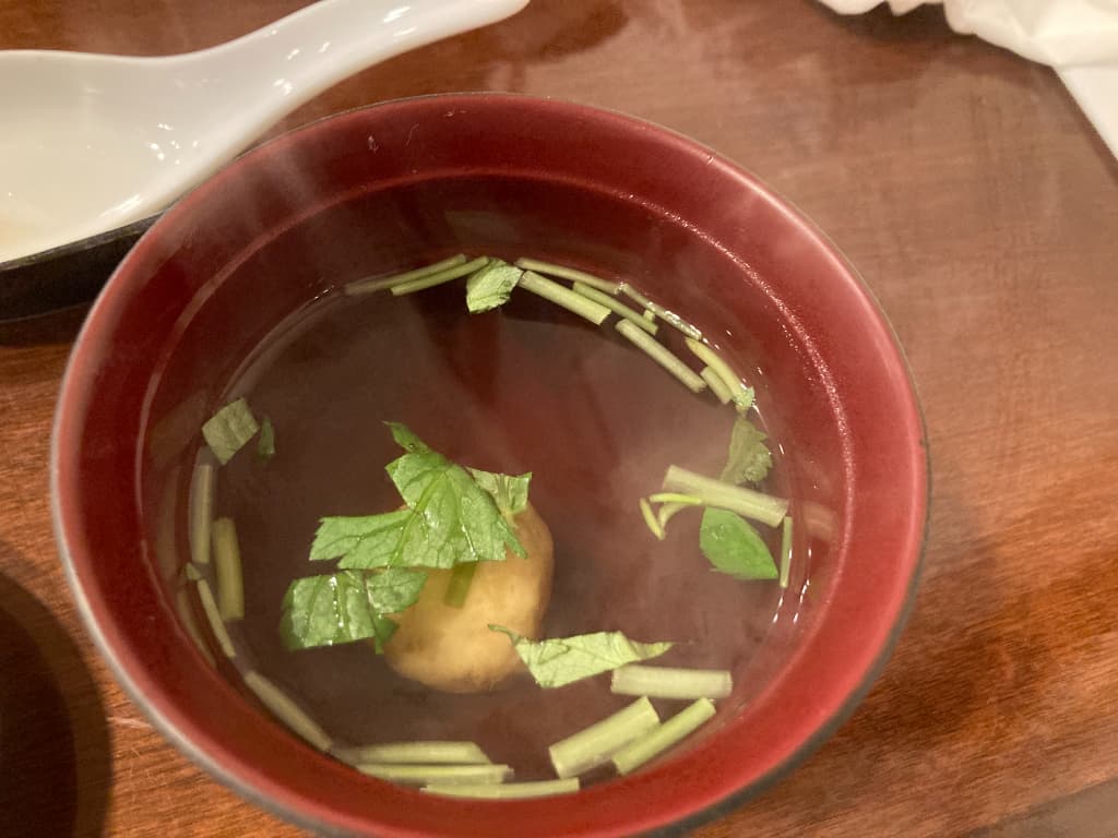 お酒でおかずを食べるのを終えて、ごはんでおかずを食べはじめたタイミングに合わせて、お椀が運ばれてくる