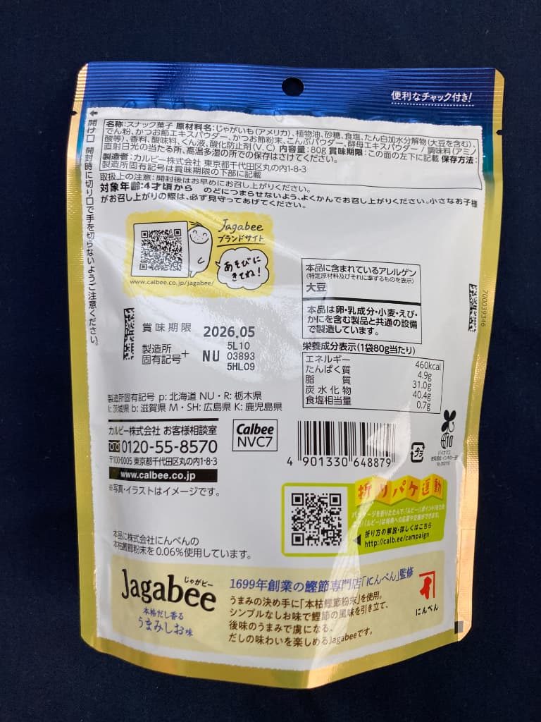 にんべんとカルビーは共同で、新しい味のジャガビーを開発した だしメーカー にんべんと菓子メーカー カルビーは共同で、じゃがいもを使用した人気スナック菓子 ジャガビーの新商品を開発した。かつおだしの風味が効いたジャガビーだ。 全国のコンビニエンスストアで2026年2月から数量限定で販売される。 80g入り、およそ300円前後で販売される予定。 関連記事: コストコ 金沢シーサイド倉庫店 攻略のあゆみ(2025年8月~) 横浜市磯子区で、30年前の値段でランチ海鮮丼を食べさせてくれるお店を見つけた にしき寿司 京急金沢文庫駅そばで、江東区のがっつり系カレー ジャンカレーみたいなカレーを食べさせてくれるお店を見つけた。名前は田園 首都圏JRのエキナカ飲食店舗が合同で、期間限定新メニューを発表