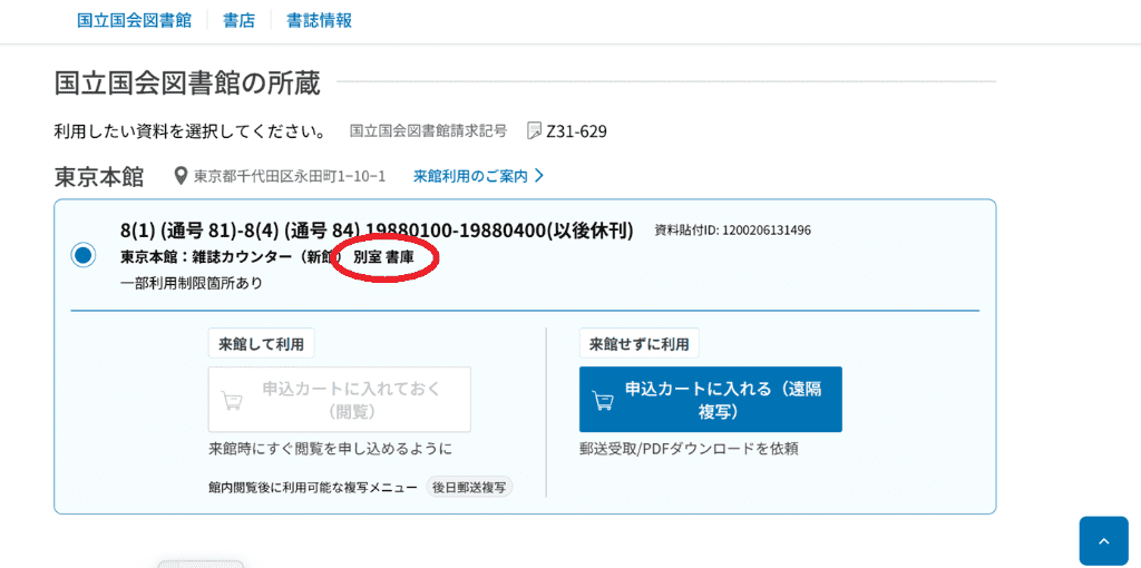 実際に雑誌別室(=写真左上)に行き、担当の人に閲覧を申し込む。別室にも検索用の端末があるので、あらかじめ図書IDを控えておくとスムーズだ。