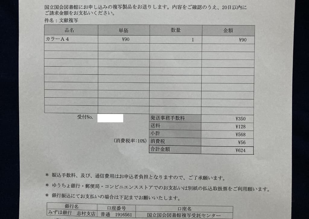 複写物は申し込んでから5,6日で到着した。気になる料金は写真の通りで、実費の送料は通常郵便の定形外郵送料だった。 コピー代と事務手数料は定額だが、実費の配送に郵便を使うか宅配便を使うかは、こちらで決めることはできず、担当者が決めるそうだ。